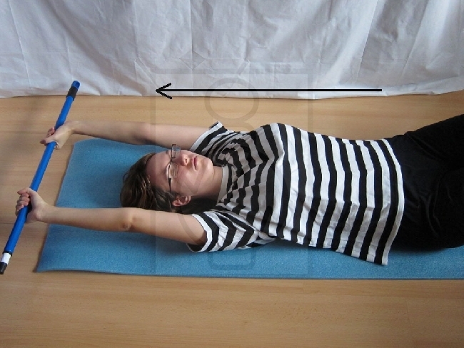 Die Ausgangsstellung: Rückenlage, untere Gliedmassen sind in die Knie gebeugt, die Arme liegen locker neben dem Körper, die Hände nehmen eine Langhantelstange (es kann eine Stange aus dem Mopp sein)