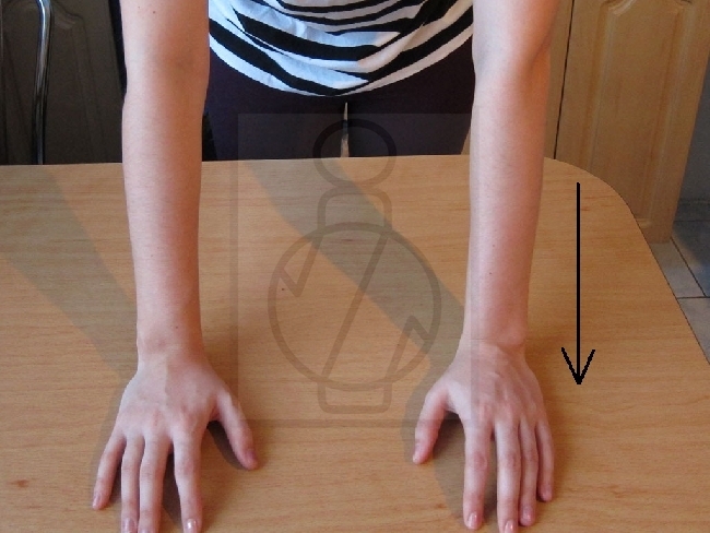1. Die Ausgangsstellung - Mit der gesunden Hand die Schwache Hand greifen. - 1A mit dem Einatmen heben wir die gestreckten Arme über den Kopf an.- 1B. Mit dem Ausatmen zurück in die Ausgangsstellung. Jeden Schritt 6 mal wiederholen.