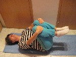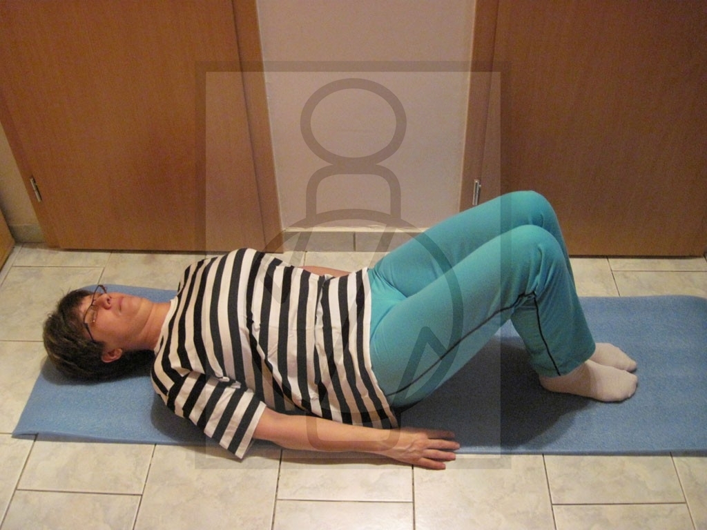 3. Shrug your leg in knees, hands placed on the abdomen below the navel. Inhale, exhale, pull in - stretch abdominal muscles – try to move it closer to spine, stay for a few seconds, relax. Hands freely copy the movement of the abdominal muscles. Repeat 5 to 10 times.